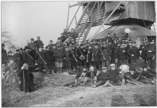 obige Bild bei dem sich eine Jagdgesellschaft vor der Mühle getroffen hat -